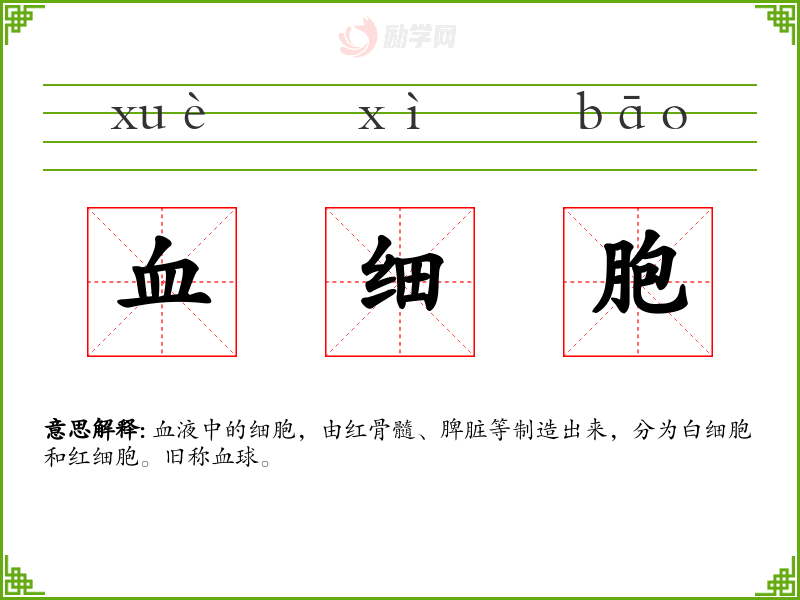 血细胞的意思是:血液中的细胞,由红骨髓、脾脏等制造出来,分为白细胞和红细胞。旧称血球。