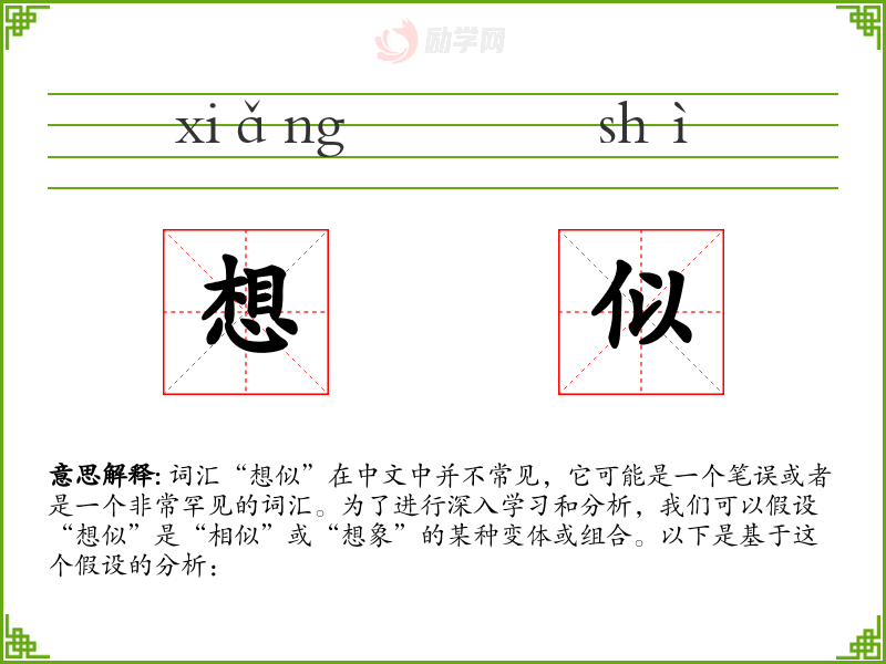 - “想似”作为一个假设的词汇,展示了语言的灵活性和创造性。在语言学习和表达中,理解和运用这样的词汇可以增强表达的丰富性和深度。