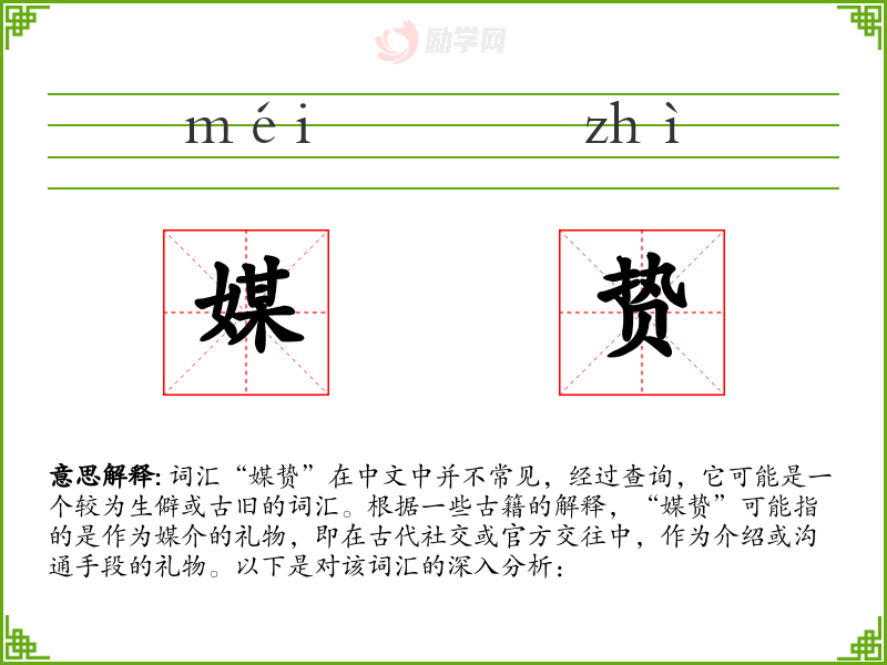 词汇“媒贽”在中文中并不常见,经过查询,它可能是一个较为生僻或古旧的词汇。根据一些古籍的解释,“媒贽”可能指的是作为媒介的礼物,即在古代社交或官方交往中,作为介绍或沟通手段的礼物。以下是对该词汇的深入分析: