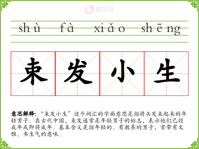 “束发小生”这个词汇源自*古代的文化俗,当时男子成年后会将头发束起,以示成年。随着时间的推移,这个词汇逐渐被用来形容年轻的、有学识的男子,尤其是在文学作品中。
