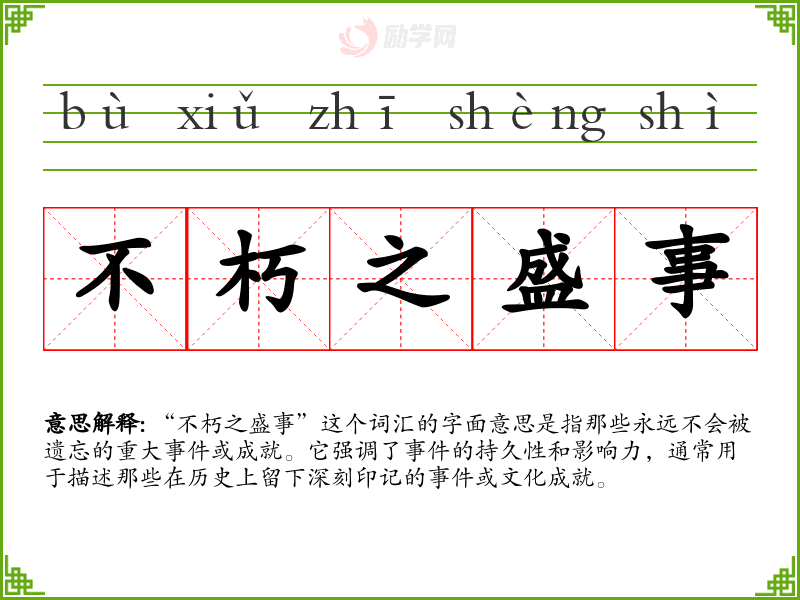 “不朽之盛事”这个词汇的字面意思是指那些永远不会被遗忘的重大或成就。它强调了的持久性和影响力,通常用于描述那些在历史上留下深刻印记的**或文化成就。
