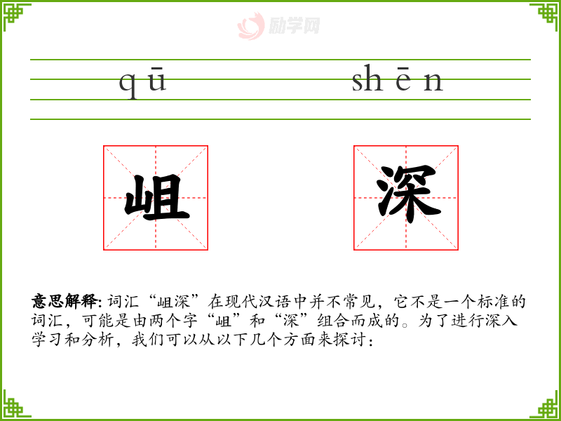 词汇“岨深”在现代汉语中并不常见,它不是一个标准的词汇,可能是由两个字“岨”和“深”组合而成的。为了进行深入学*和分析,我们可以从以下几个方面来探讨: