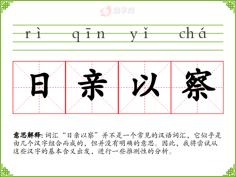虽然“日亲以察”不是一个常见的词汇,但通过对组成它的汉字的基本含义的分析,我们可以推测它可能表达了一种日常的、细致的观察行为。在语言学习和表达中,理解词汇的基本含义和可能的组合方式是非常重要的。