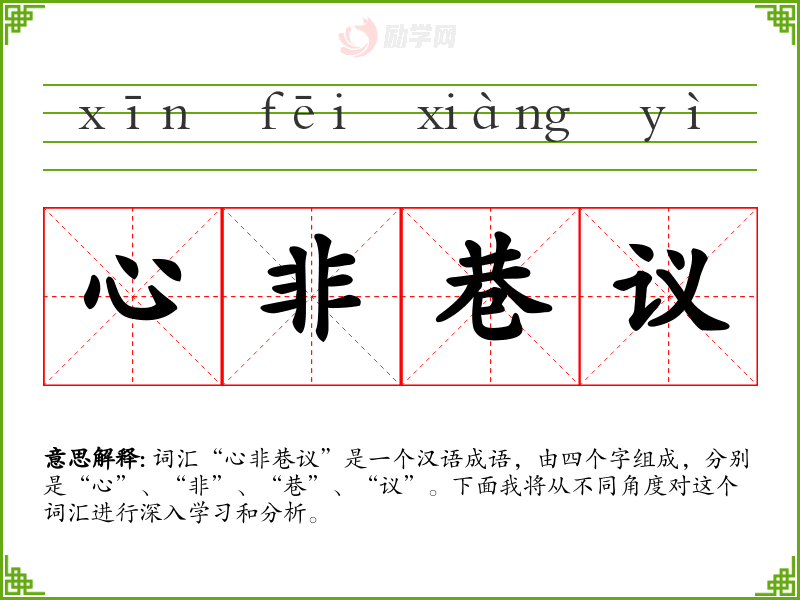 词汇“心非巷议”是一个汉语成语,由四个字组成,分别是“心”、“非”、“巷”、“议”。下面我将从不同角度对这个词汇进行深入学*和分析。
