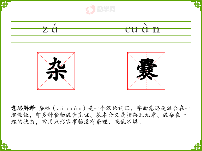 杂糅(zá cuàn)是一个汉语词汇,字面意思是混合在一起做饭,即多种食物混合烹饪。基本含义是指杂乱无章、混杂在一起的状态,常用来形容事物没有条理、混乱不堪。