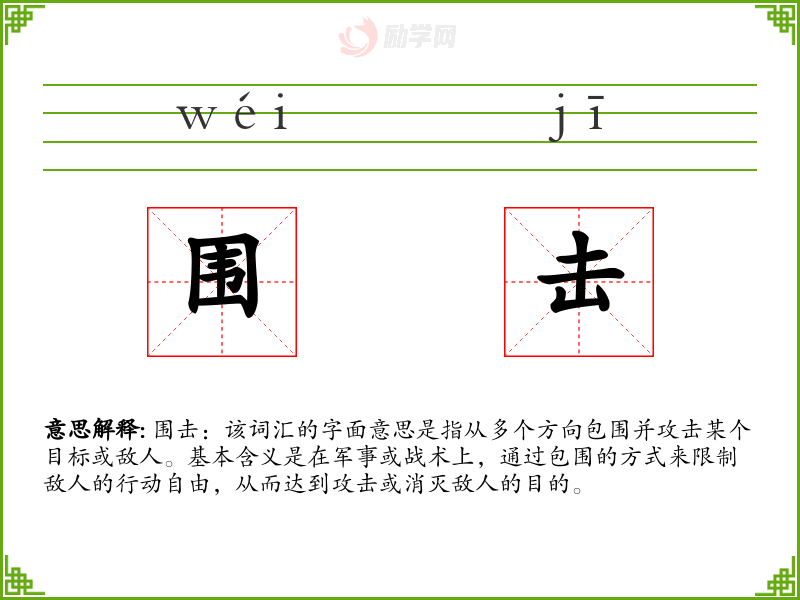 围击:该词汇的字面意思是指从多个方向包围并攻击某个目标或敌人。基本含义是在军事或战术上,通过包围的方式来限制敌人的行动自由,从而达到攻击或消灭敌人的目的。