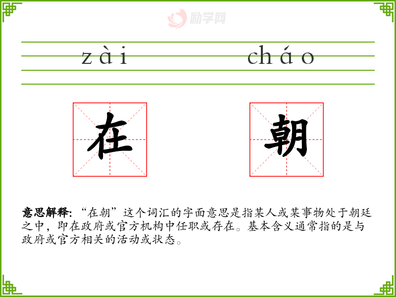 “在朝”这个词汇的字面意思是指某人或某事物处于朝廷之中,即在政府或官方机构中任职或存在。基本含义通常指的是与政府或官方相关的活动或状态。