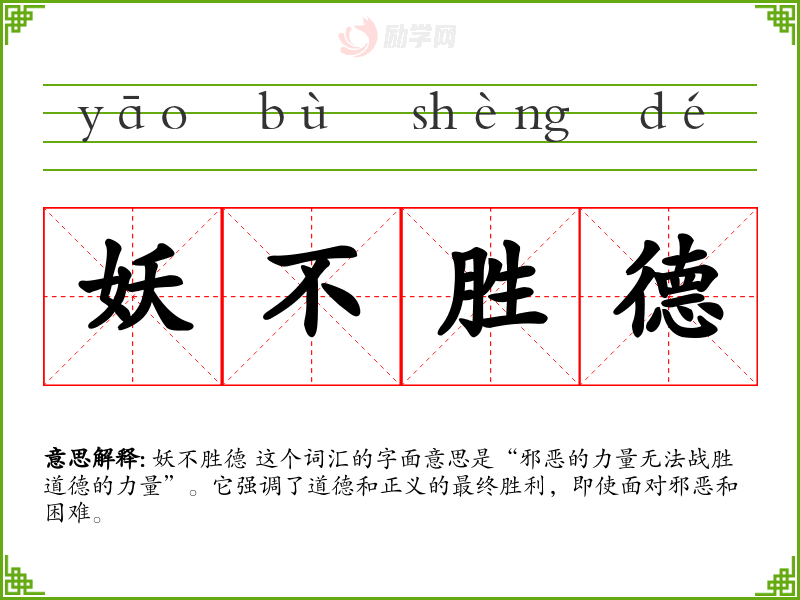 妖不胜德 这个词汇的字面意思是“邪恶的力量无法战胜道德的力量”。它强调了道德和正义的最终胜利,即使面对邪恶和困难。