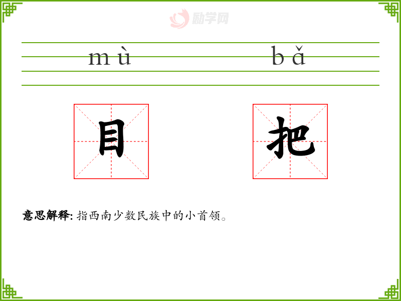 《说文》-目,人眼,象形。 《礼记·郊特牲。》-目者,气之清明者也。 《韩诗外传》-目者,心之符也。 《易·小畜卦》-夫妻反目。 《左传·宣公二年》-睅其目,皤其腹。 宋·范仲淹《岳阳楼记》-满目萧然。 晋·干宝《搜神记》-瞋目大怒。 《聊斋志异·狼三则》-目似瞑。 清·薛福成《观巴黎油画记》-目不忍睹。