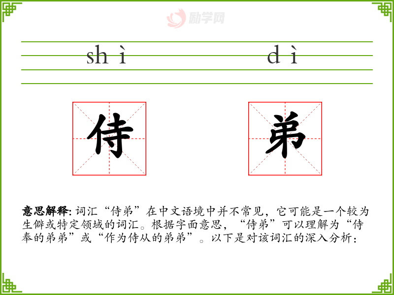 “侍弟”的字面意思是指一个弟弟在家庭或社会中担任侍从或侍奉的角色。这可能涉及到在家庭中帮助**或在外部环境中为他人服务。