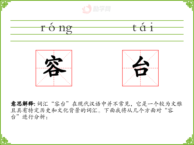 “容台”是一个充满历史和文化韵味的词汇,虽然在现代汉语中不常用,但它体现了汉语丰富的历史底蕴和文化内涵。在学*语言和文学时,了解这样的词汇有助于更深入地理解**传统文化。