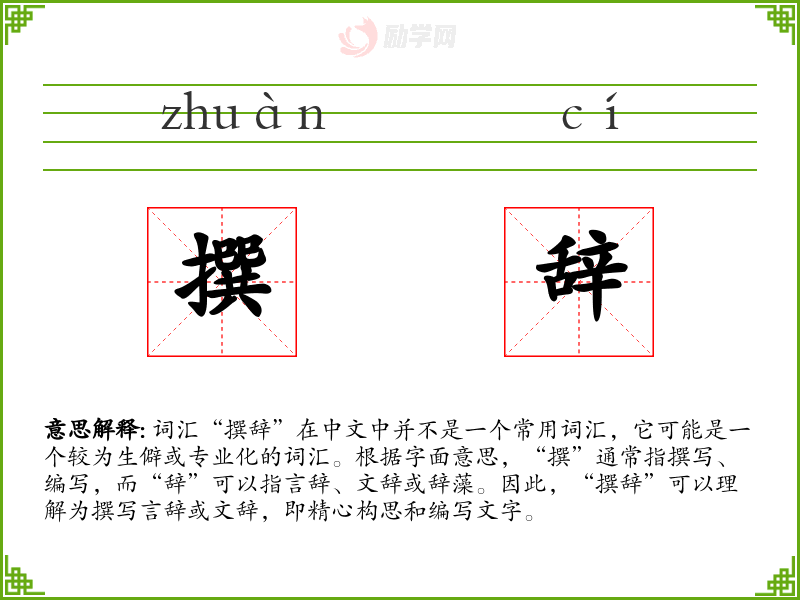 “撰辞”这个词虽然不常用,但它强调了在写作和表达中的用心和技巧。在语言学*和表达中,理解和运用这样的词汇可以提升我们的语言艺术水平。
