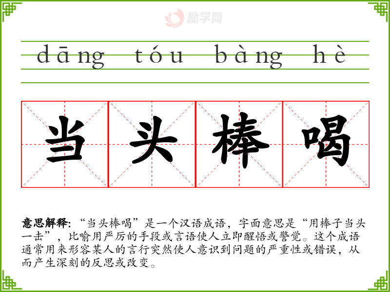 “当头棒喝”是一个汉语成语,字面意思是“用棒子当头一击”,比喻用严厉的手段或言语使人立即醒悟或警觉。这个成语通常用来形容某人的言行突然使人意识到问题的严重性或错误,从而产生深刻的反思或改变。