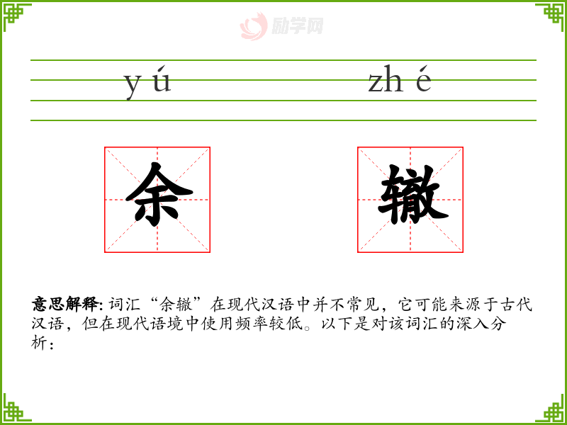 词汇“余辙”在现代汉语中并不常见,它可能来源于古代汉语,但在现代语境中使用频率较低。以下是对该词汇的深入分析: