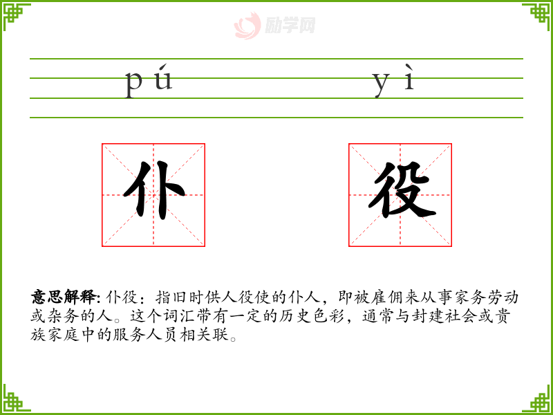 - 同义词:仆人、佣人、家丁、侍从。这些词汇在指代被雇佣从事家务劳动的人时相似,但“仆役”更多带有一种历史和阶层的意味。