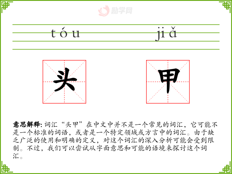- 由于“头甲”不是一个常用词汇,对其的理解和应用可能有限。在语言学*和表达中,了解特定领域或历史背景下的词汇是重要的,这有助于丰富语言知识和文化理解。