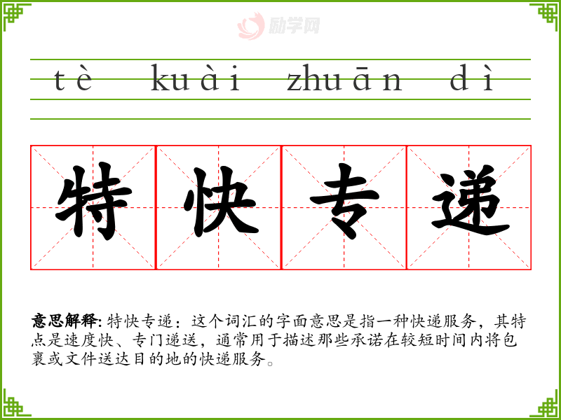特快专递:这个词汇的字面意思是指一种快递服务,其特点是速度快、专门递送,通常用于描述那些承诺在较短时间内将包裹或文件送达目的地的快递服务。
