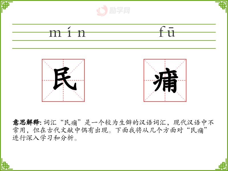 通过对“民痡”的学*和分析,我们可以更深入地理解古代汉语的丰富性和复杂性,以及古代文人对社会现实的关注。虽然这一词汇在现代汉语中不常用,但了解它有助于我们更好地把握汉语文化的深厚底蕴。