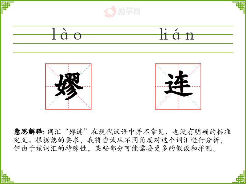 由于“嫪连”不是一个标准词汇,我们无法对其进行深入的分析和理解。在语言学习和表达中,了解和掌握标准词汇是非常重要的,这有助于我们更准确地沟通和表达。
