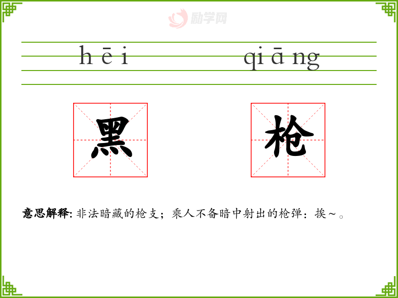 黑枪的意思是:非法暗藏的枪支;乘人不备暗中射出的枪弹:挨~。