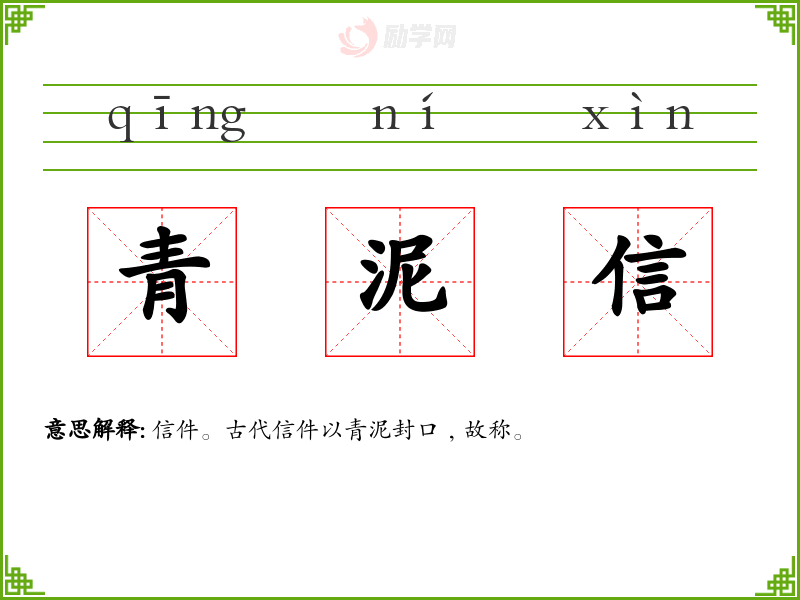 青泥信的意思是:信件。古代信件以青泥封口﹐故称。