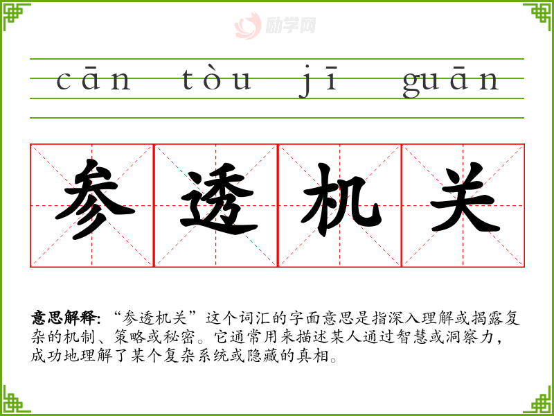 “参透机关”这个词汇的字面意思是指深入理解或揭露复杂的机制、策略或秘密。它通常用来描述某人通过智慧或洞察力,成功地理解了某个复杂系统或隐藏的真相。
