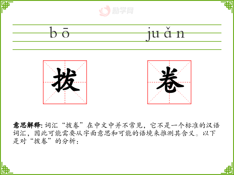 词汇“拨卷”在中文中并不常见,它不是一个标准的汉语词汇,因此可能需要从字面意思和可能的语境来推测其含义。以下是对“拨卷”的分析: