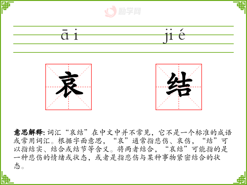 “哀结”这个词虽然不常见,但它提供了一种表达深沉悲伤和情感纠葛的方式。在语言学*和表达中,了解和掌握这样的词汇可以帮助我们更丰富地表达情感和思想。尽管它不常用,但在特定的文学或情感表达中,它可能是一个有力的工具。