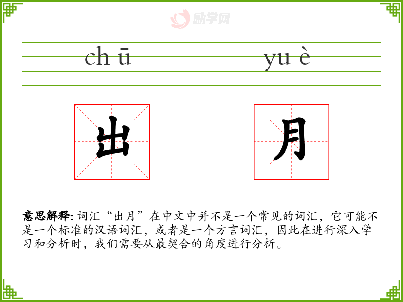 词汇“出月”在中文中并不是一个常见的词汇,它可能不是一个标准的汉语词汇,或者是一个方言词汇,因此在进行深入学习和分析时,我们需要从最契合的角度进行分析。