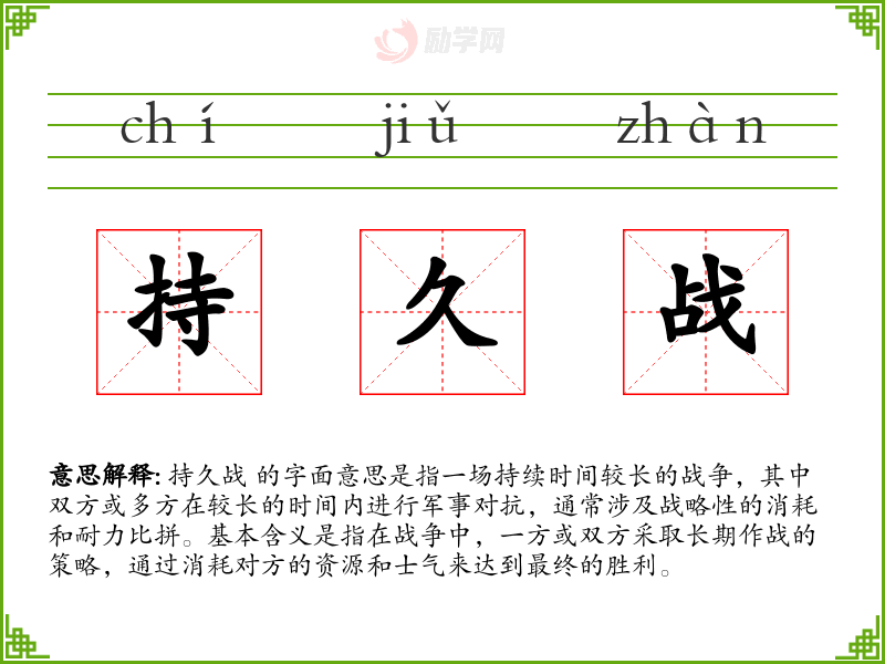 持久战的意思是:持续时间较长的战争。是在一方较强大并企图速战速决的条件下,另一方采取逐步削弱敌人、最后战胜敌人的战略方针而形成的。