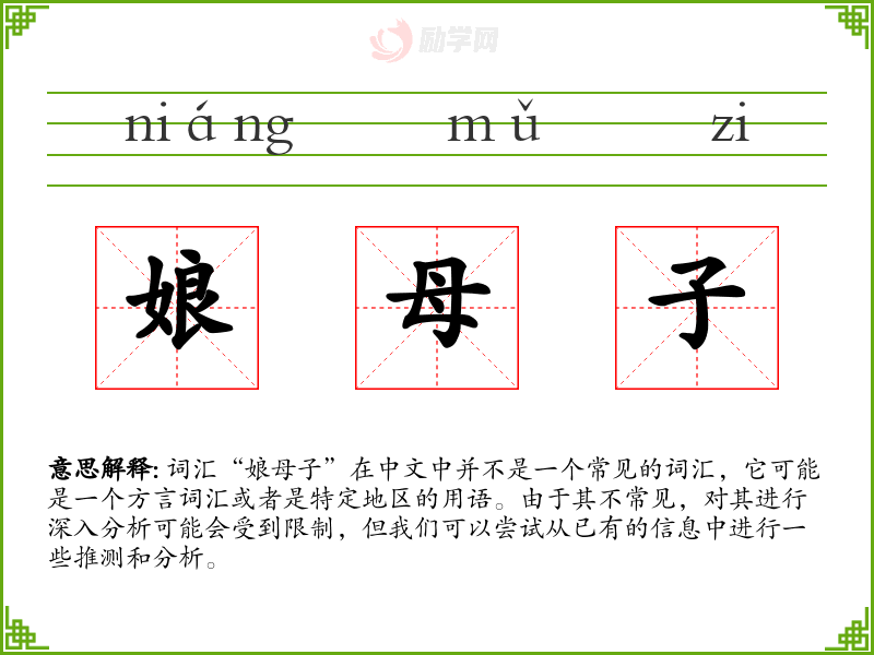 “娘母子”这个词汇的字面意思可能指的是“母亲和女儿”或者“母女关系”。在中文中,“娘”通常指母亲,“子”可以指女儿或者孩子。因此,这个词汇可能是在描述一种亲属关系。