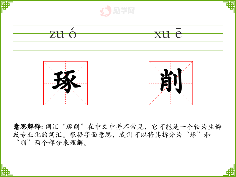 词汇“琢削”在中文中并不常见,它可能是一个较为生僻或专业化的词汇。根据字面意思,我们可以将其拆分为“琢”和“削”两个部分来理解。