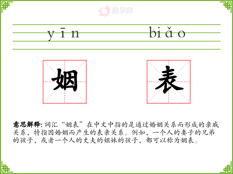 “姻表”字面意思是通过婚姻关系连接的表亲。它强调了这种亲戚关系是通过婚姻而非血缘建立的。