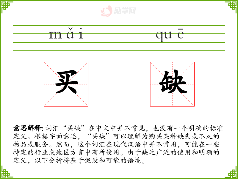 词汇“买缺”在中文中并不常见,也没有一个明确的标准定义。根据字面意思,“买缺”可以理解为购买某种缺失或不足的物品或服务。然而,这个词汇在现代汉语中并不常用,可能在一些特定的行业或地区方言中有所使用。由于缺乏广泛的使用和明确的定义,以下分析将基于假设和可能的语境。