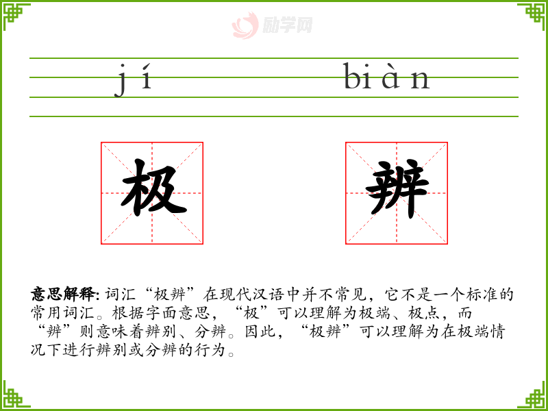 词汇“极辨”在现代汉语中并不常见,它不是一个标准的常用词汇。根据字面意思,“极”可以理解为极端、极点,而“辨”则意味着辨别、分辨。因此,“极辨”可以理解为在极端情况下进行辨别或分辨的行为。