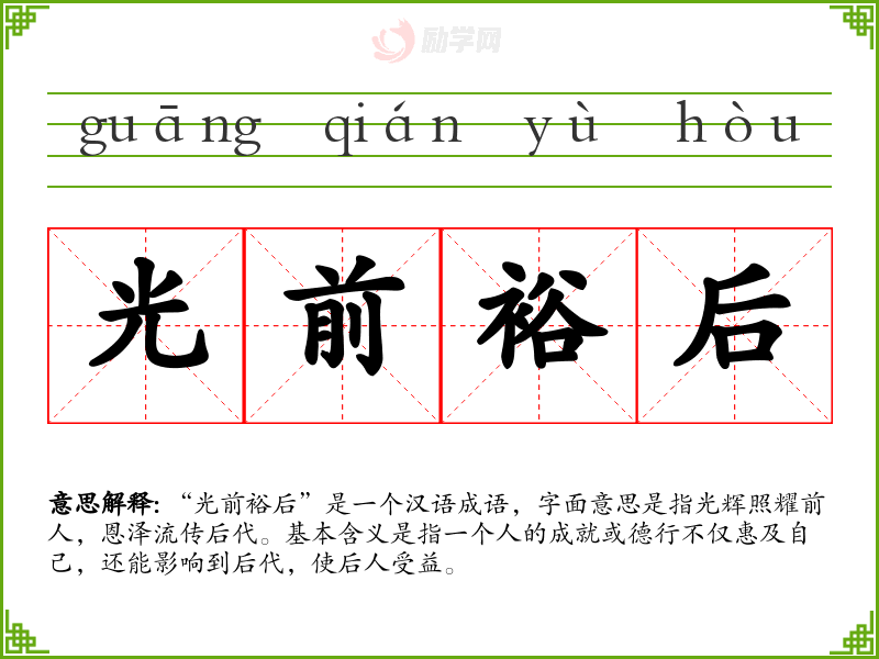 光前裕后的意思是:光前:光大前业;裕后:遗惠后代。为祖先增光,为后代造福。形容人功业伟大。