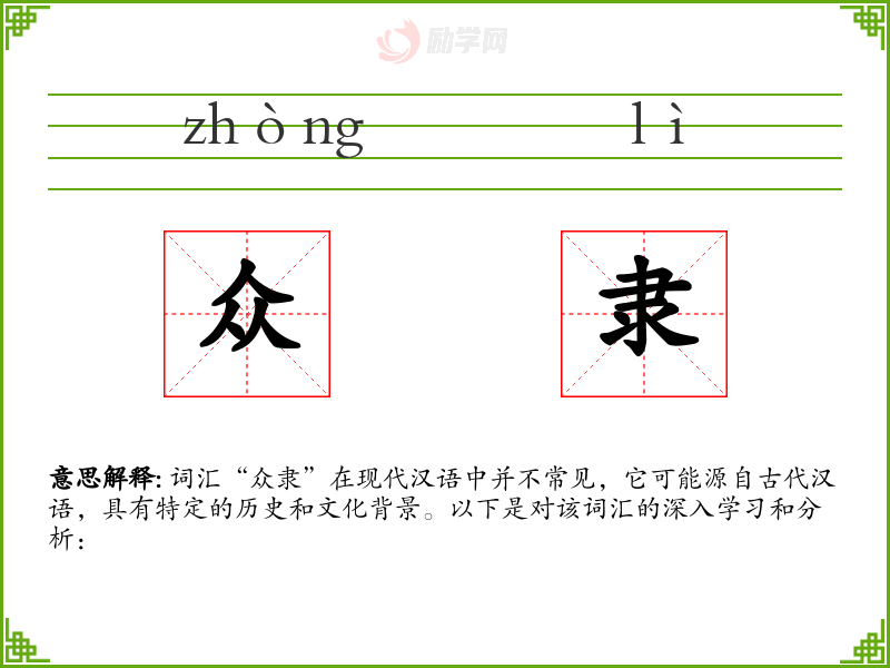 词汇“众隶”在现代汉语中并不常见,它可能源自古代汉语,具有特定的历史和文化背景。以下是对该词汇的深入学*和分析: