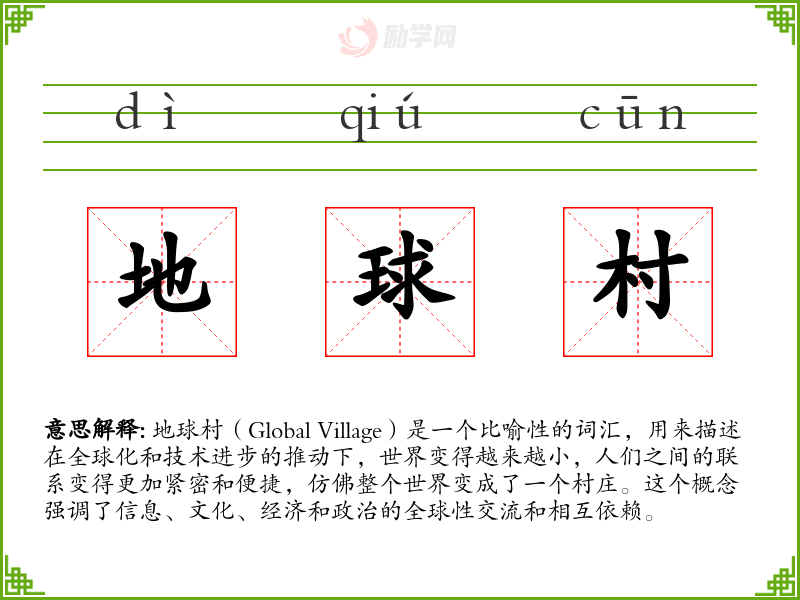 地球村(Global Village)是一个比喻性的词汇,用来描述在全球化和技术进步的推动下,世界变得越来越小,人们之间的联系变得更加紧密和便捷,仿佛整个世界变成了一个村庄。这个概念强调了信息、文化、经济和政治的全球性交流和相互依赖。