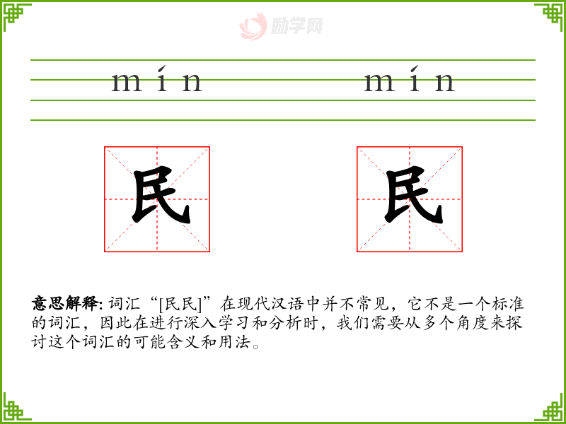 词汇“[民民]”在现代汉语中并不常见,它不是一个标准的词汇,因此在进行深入学习和分析时,我们需要从多个角度来探讨这个词汇的可能含义和用法。