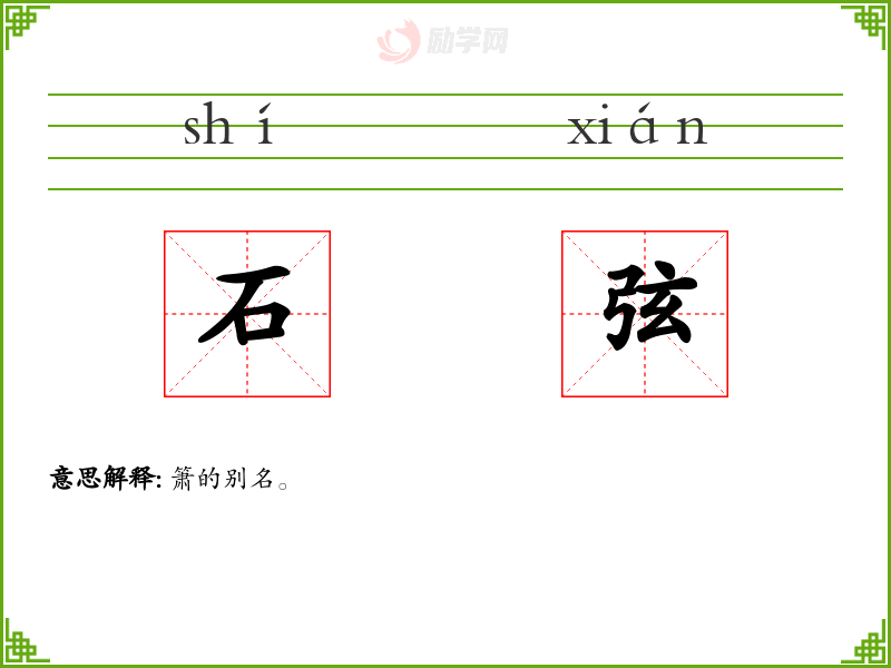 《说文》-弦,弓弦也。从弓,象丝轸之形。 《文选·王文宪集序》-无待韦弦。 《韩非子·观行》-故佩弦以自急。 《淮南子·人间训》-引弦而战。 南朝梁·丘迟《与陈伯之书》-抚弦登陴。