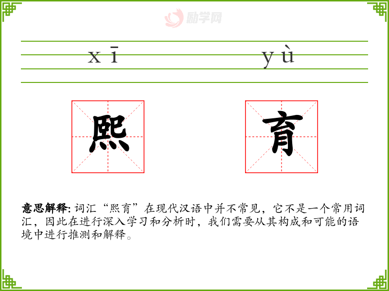 词汇“熙育”在现代汉语中并不常见,它不是一个常用词汇,因此在进行深入学习和分析时,我们需要从其构成和可能的语境中进行推测和解释。