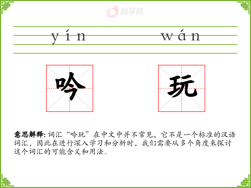 词汇“吟玩”在中文中并不常见,它不是一个标准的汉语词汇,因此在进行深入学*和分析时,我们需要从多个角度来探讨这个词汇的可能含义和用法。