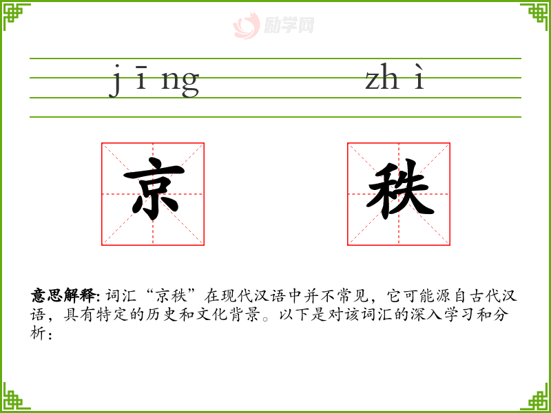 词汇“京秩”在现代汉语中并不常见,它可能源自古代汉语,具有特定的历史和文化背景。以下是对该词汇的深入学*和分析: