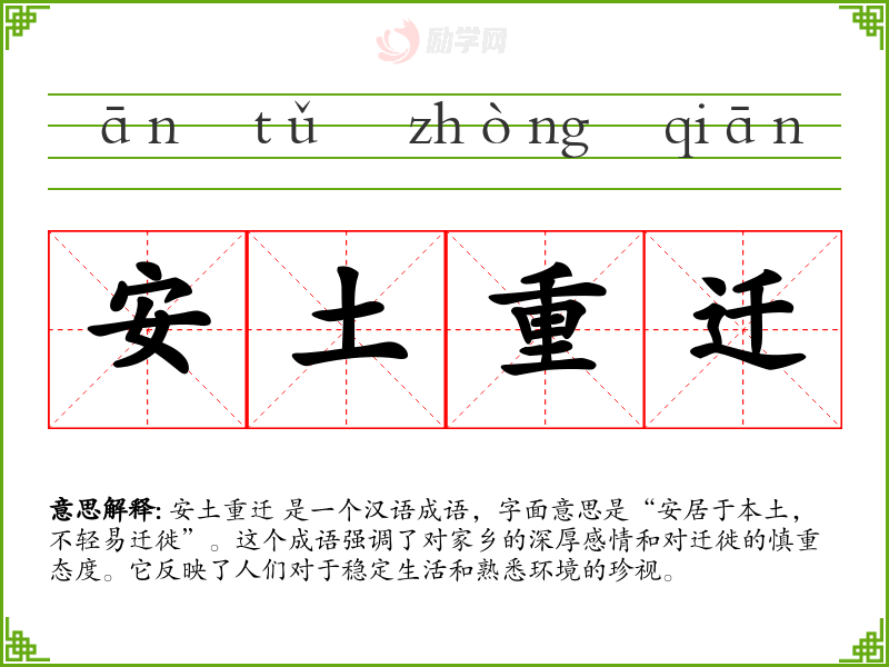 安土重迁 是一个汉语成语,字面意思是“安居于本土,不轻易迁徙”。这个成语强调了对家乡的深厚感情和对迁徙的慎重态度。它反映了人们对于稳定生活和熟悉环境的珍视。