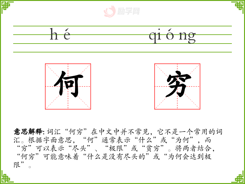 词汇“何穷”在中文中并不常见,它不是一个常用的词汇。根据字面意思,“何”通常表示“什么”或“为何”,而“穷”可以表示“尽头”、“极限”或“贫穷”。将两者结合,“何穷”可能意味着“什么是没有尽头的”或“为何会达到极限”。
