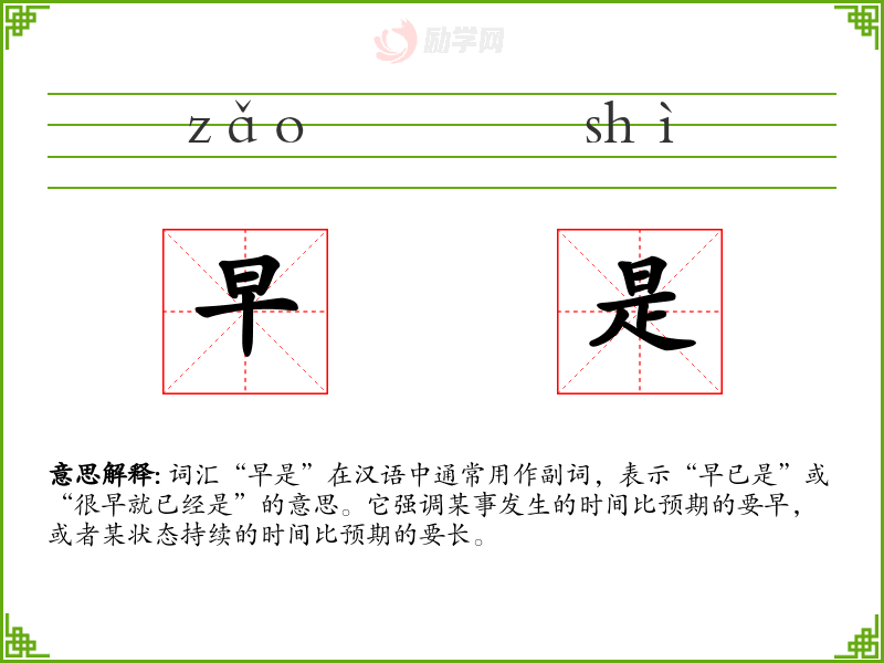 词汇“早是”在汉语中通常用作副词,表示“早已是”或“很早就已经是”的意思。它强调某事发生的时间比预期的要早,或者某状态持续的时间比预期的要长。