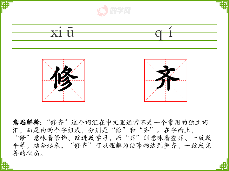 “修齐”这个词汇在中文里通常不是一个常用的独立词汇,而是由两个字组成,分别是“修”和“齐”。在字面上,“修”意味着修饰、改进或学*,而“齐”则意味着整齐、一致或平等。结合起来,“修齐”可以理解为使事物达到整齐、一致或完善的状态。