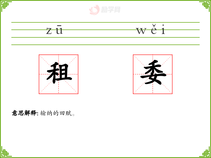 《说文》-租,田赋也。 《广雅》-租,税也。 《急就篇》-敛财曰赋,敛谷曰税,田税曰租。 《管子·国蓄》-租籍者,所以强求也。 《汉书·文帝纪》-其赐天下民今年田租之半。 唐·杜甫《兵车行》-县官急索租。 唐·柳宗元《捕蛇者说》-当其租入。