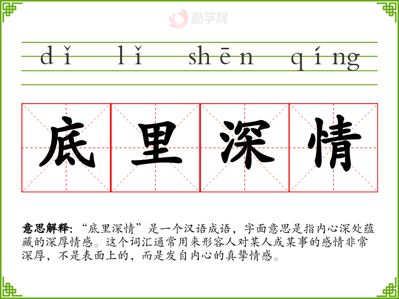 “底里深情”是一个汉语成语,字面意思是指内心深处蕴藏的深厚情感。这个词汇通常用来形容人对某人或某事的感情非常深厚,不是表面上的,而是发自内心的真挚情感。