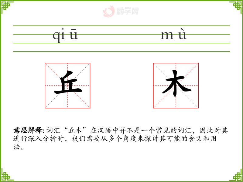 词汇“丘木”在汉语中并不是一个常见的词汇,因此对其进行深入分析时,我们需要从多个角度来探讨其可能的含义和用法。
